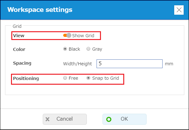 On "Workspace settings", selecting the "Show grid" and "Snap to Grid" options will display gridlines and cause elements to snap to the grid when they are inserted into the label or repositioned. With this configuration, you may experience problems re-positioning or re-sizing elements if the "Spacing" value is too large.As a general rule, use of a "Spacing" value of 10 mm or less is recommended.