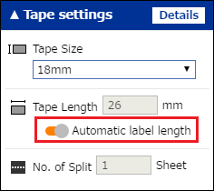 When the "Automatic label length" label setting is turned off, the "Tape settings" becomes "Prioritize text size". Turning on the "Automatic label length" label setting causes "Text box settings" to become "Fixed box height", and text to be inserted at the beginning of the text box and matched to the print area height.