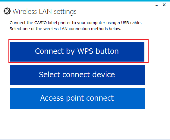 [Connect using the WPS button of the wireless LAN router/access point.] (1) On the printer, hold down the Wireless LAN key for at least three seconds. This puts the printer into simple connection standby, which is indicated by the wireless LAN lamp flashing green, in two quick flash bursts. (2) Within about the next two minutes, press the WPS (Wi-Fi Protected Setup) button of the wireless LAN router/access point you are using. Wireless LAN will turn off if connection cannot be established within two minutes. (3) When a connection is established, the printer’s wireless LAN lamp lights green. [Connect using a PIN code.] (1) Connect the printer to your computer using a USB cable. (2) On the menu bar, click "Settings" and then select "Wireless LAN settings". (3) Select the printer you want to connect. (4) Select the wireless LAN router/access point connection method. Click "Connect by WPS button".