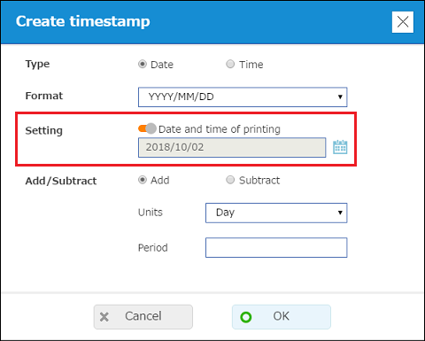 When using a time stamp with the "Date and time of printing" setting turned on, do not insert a time stamp directly into a table cell. If you want to use a time stamp in a table, create the time stamp outside of the table, re-size the time stamp text and configure other settings as required, and then move the time stamp so it is on top of an empty table cell.