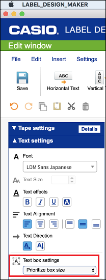 When printing merge data that consists of long text strings, the text may not fit on the label and will run off the edge.With merge printing, all printed labels are the same length, text boxes and the label length should be sized to so they are large enough for the longest text string in the merge data. Also, selecting "Prioritize box size" for "Text box settings" will cause the printer to automatically reduces the size of text in the case of a long text string so it can fit.