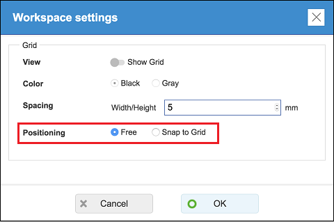 [When "Free" is selected for the "Workspace settings" "Positioning" setting] When there is another element near the element you are selecting, re-positioning the selected element will cause a dotted orange line to appear along the edge of the nearby element to make it easier to align with it. At this time, the element you are moving will snap to the edge alignment of the nearby element. If there are multiple adjacent elements within the workspace, elements may move unexpectedly.Use "Align" and "Justify" as required to align elements. [When "Snap to Grid" is selected for the "Workspace Settings" "Positioning" setting] Elements snap to the grid when they are inserted into the label or repositioned.Selecting an element that is currently not positioned on a gridline will causes that element to snap to the grid. Use "Align" and "Justify"" as required to align elements.Or you can select "Free" for the "Workspace Settings" "Positioning" setting. Also, you can select a particular element and enable "Align" to center the element's text in the print area or to align it with the edge of the print area.