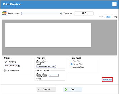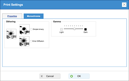 Dithering and gamma can be adjusted. (1) Click the "Print/Print preview" button to display the Print Preview dialog box. (2) Click the "Properties" in the lower right corner to display the Print Settings dialog box.