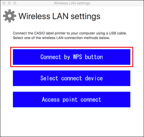 [Connect using the WPS button of the wireless LAN router/access point.] (1) On the printer, hold down the Wireless LAN key for at least three seconds. This puts the printer into simple connection standby, which is indicated by the wireless LAN lamp flashing green, in two quick flash bursts. (2) Within about the next two minutes, press the WPS (Wi-Fi Protected Setup) button of the wireless LAN router/access point you are using. Wireless LAN will turn off if connection cannot be established within two minutes. (3) When a connection is established, the printer’s wireless LAN lamp lights green. [Connect using a PIN code.] (1) Connect the printer to your computer using a USB cable. (2) On the menu bar, click "Settings" and then select "Wireless LAN settings". (3) Select the printer you want to connect. (4) Select the wireless LAN router/access point connection method. Click "Connect by WPS button".