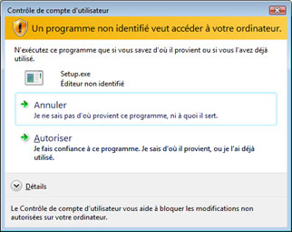 | Si vous n'êtes pas certain de la provenance du programme, il est recommandé de sélectionner « Annuler » et de ne pas exécuter le programme. | |||||