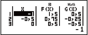 Voorbeeld: Om 'n numeriese tabel te genereer vir die funksies f(x) = x2 + 12 en g(x) = x2 - 12 vir die variasiereikwydte -1 ≦ x ≦ 1, verhoog in stappe van 0,5 (MthIO-MathO)
