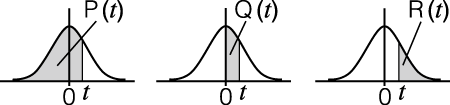 P, Q, R: Hierdie funksies neem die argument t en bepaal die waarskynlikheid van standaard-normale verspreiding soos hier onder geïllustreer.