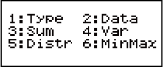 (STAT/DIST) om die Statistiek-keuselys te vertoon.