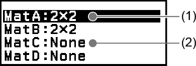 شاشة قائمة متغيرات المصفوفة هي بوابة الدخول التي يجب أن تستخدمها عندما تريد تخزين مصفوفة إلى متغير مصفوفة MatA أو MatB أو MatC أو MatD، أو لتحرير مصفوفة مخزنة مسبقًا. يشار إلى حالة كل متغير مصفوفة كما هو موضح في الأمثلة أدناه.