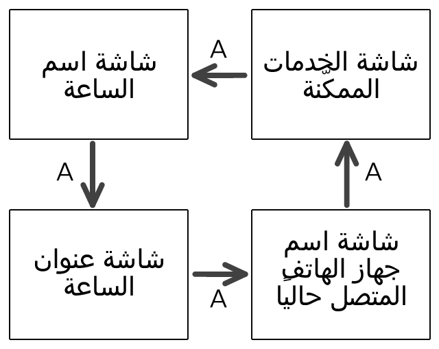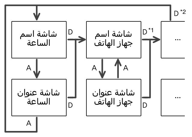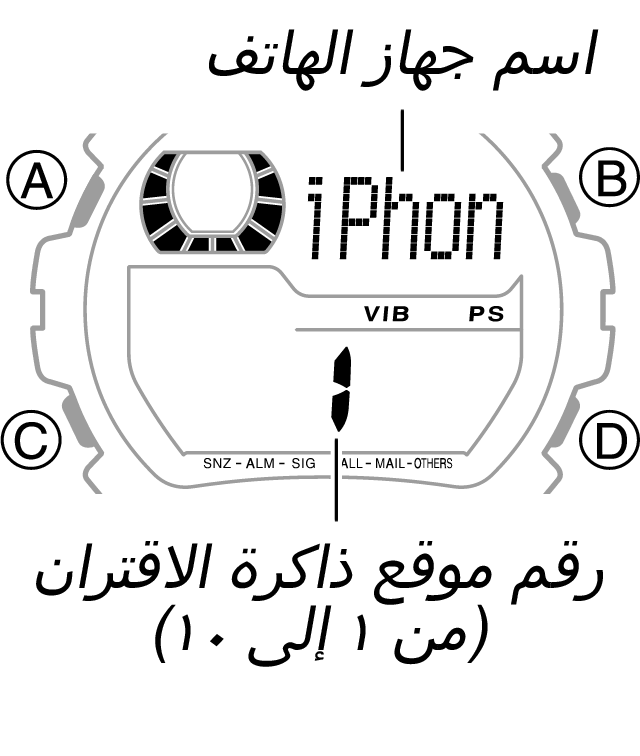 *2 يؤدي الضغط على الزر D بعد عرض شاشات أسماء أجهزة الهواتف المقترنة جميعها إلى العودة إلى شاشة اسم الساعة.