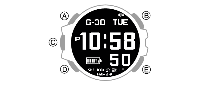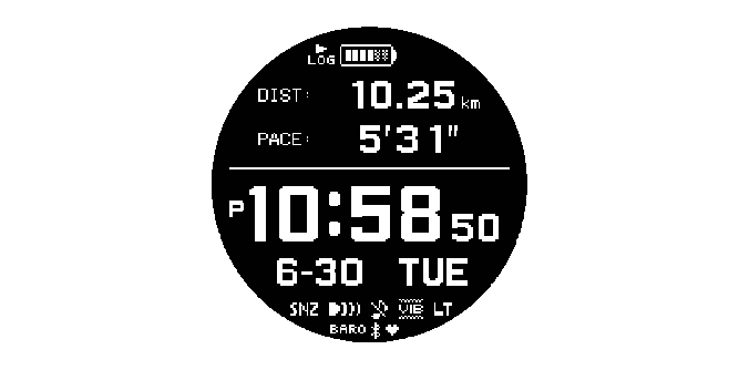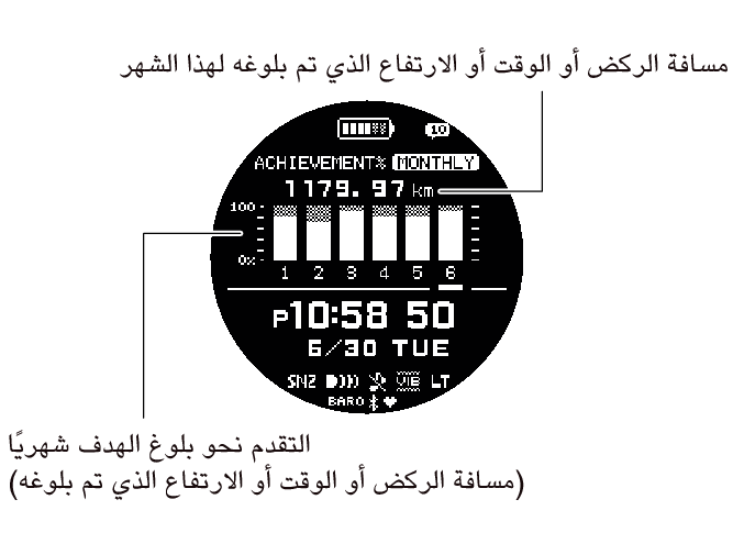 تعرض هذه الشاشة الوقت الحالي ومسافة الركض لهذا الشهر والتقدم نحو بلوغ هدف مسافة الركض شهريًا. يمكنك أيضًا تحديد عرض وقت الركض أو الارتفاع الذي تم بلوغه بدلاً من مسافة الركض. تجدر الإشارة إلى أنه عليك استخدام تطبيق ”G-SHOCK MOVE“ من CASIO لتغيير البيانات التي يجب عرضها (مسافة الركض ووقت الركض والارتفاع الذي تم بلوغه).