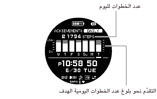 تعرض هذه الشاشة الوقت الحالي وعدد خطوات اليوم والتقدم نحو بلوغ عدد الخطوات اليومية الهدف.