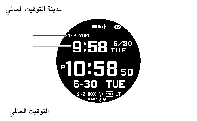 تؤدي كل ضغطة على (A) في وضع عرض التوقيت إلى تغيّر محتويات الشاشة كما هو مبيّن أدناه. تجدر الإشارة إلى أنه بإمكانك عرض الوقت الحالي إلى جانب نوع آخر من المعلومات.