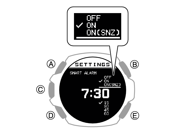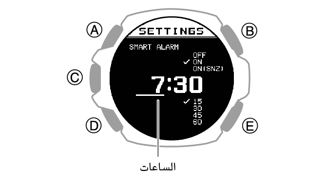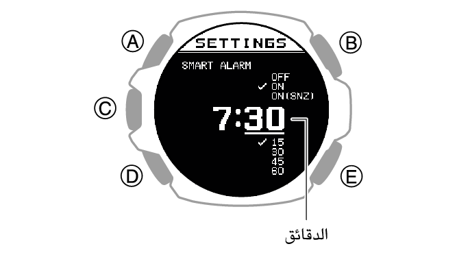 استخدم (A) و(D) لتحديد إعداد تشغيل/إيقاف تشغيل المنبه الذكي ووظيفة التأجيل الذي تريده.