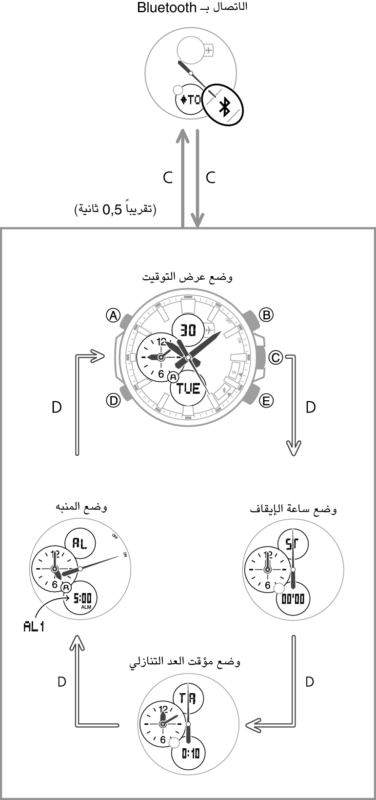 استخدم (D) للتنقل بين الأوضاع. اضغط باستمرار على (D) لمدة ثانيتين تقريبًا للدخول في وضع عرض التوقيت. لإنشاء اتصال بهاتف، اضغط باستمرار على (C) لمدة 0٫5 ثانية تقريبًا.