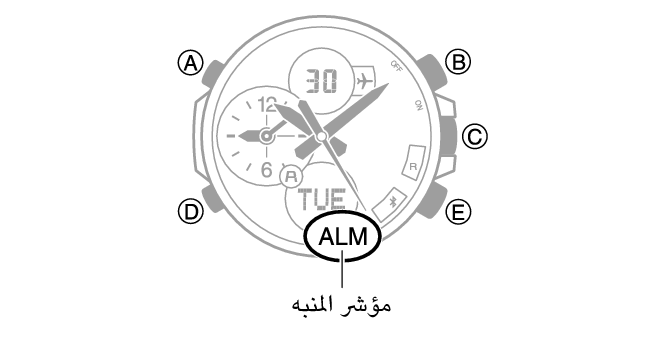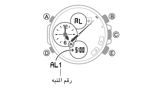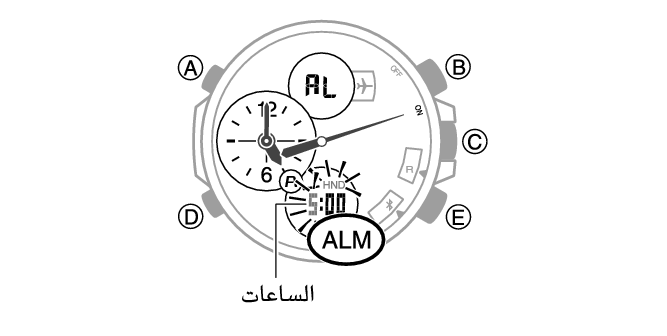 الزرّان (B) و (E): يُستخدم لتغيير الخانات المحددة حاليًا (الساعات أو الدقائق).
