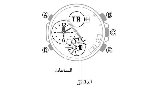 الزرّان (B) و (E): لتغيير خانات الساعات والدقائق الوامضة.