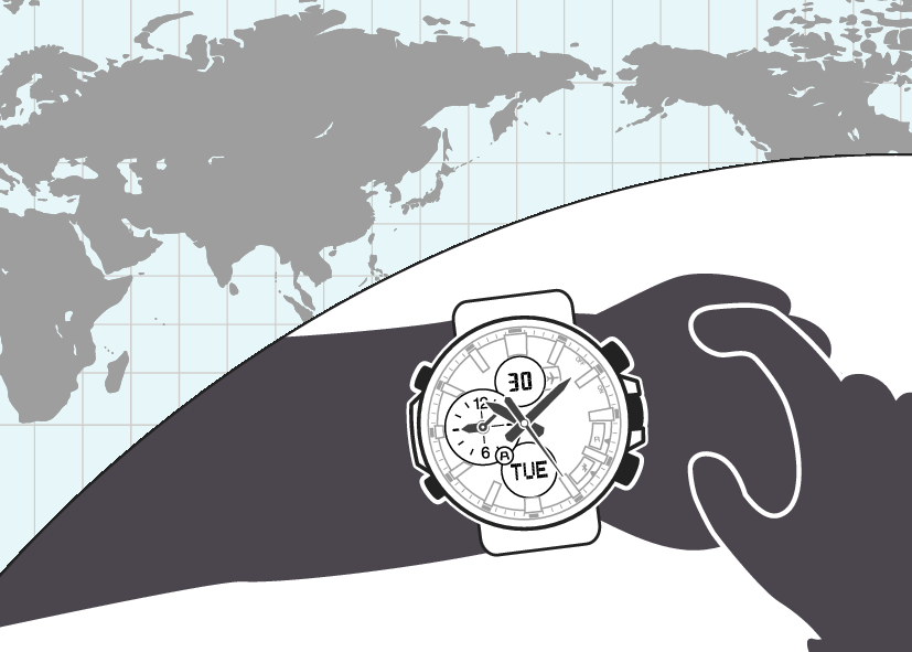 يؤدي تحديد مدينة التوقيت العالمي بواسطة CASIO WATCH+ إلى الإشارة إلى توقيت المدينة بواسطة العقارب الصغيرة للساعات والدقائق. يمكن تكوين إعدادات الساعة لتبديل توقيت مدينة التوقيت العالمي تلقائيًا إلى وقت الصيف.