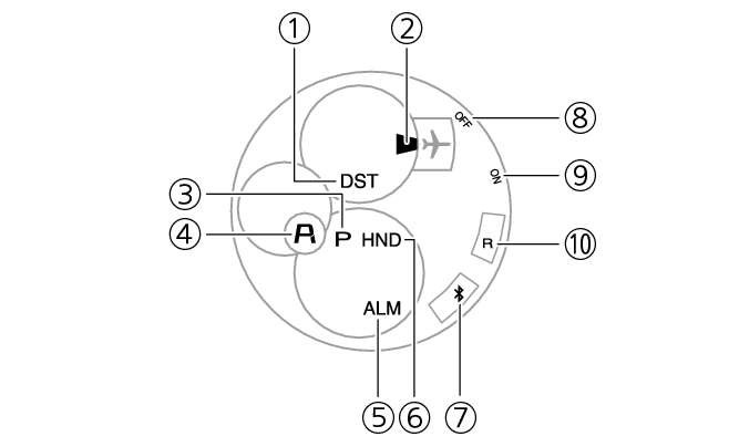 عندما تكون الساعة في وضع المنبه ويكون المنبه غير قابل للعمل، يشير عقرب الثواني إلى ”OFF“. - ⑨