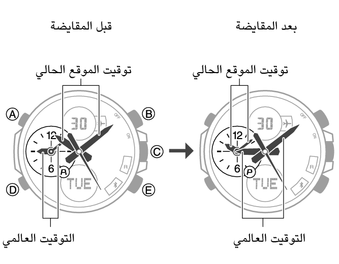 يؤدي الضغط باستمرار على (E) لمدة ثلاث ثوانٍ تقريبًا إلى تبديل التوقيت العالمي بوقت الموقع الحالي.