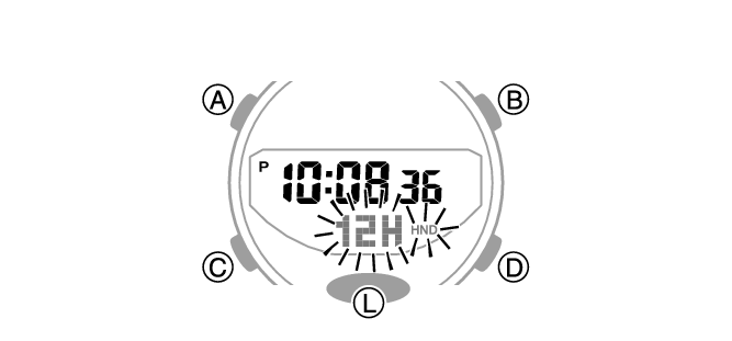3.اضغط على (D) لتبديل الإعداد بين [12H] (عرض التوقيت بتنسيق 12 ساعة) و [24H] (عرض التوقيت بتنسيق 24 ساعة).