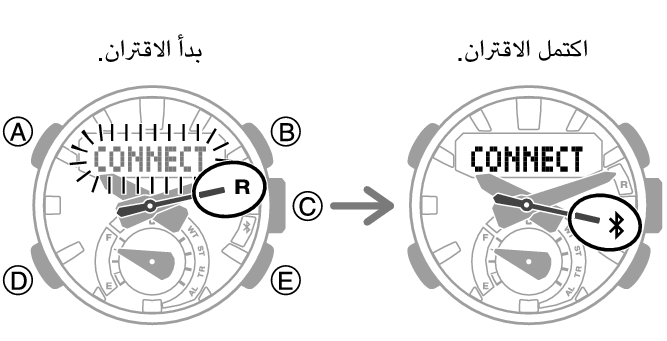 عند إنشاء اتصال بين الساعة وهاتف ما، سيتوقف [CONNECT] عن الوميض وسيتحرك عقرب الثواني من [R] إلى