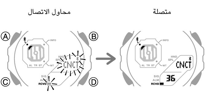 عندما يكون قد تم إنشاء اتصال بين الساعة والهاتف، سيتوقف [CNCT] عن الوميض.