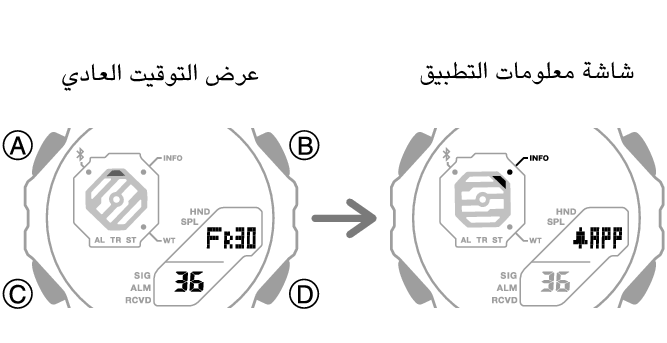 عند تلقي معلومات CASIO WATCHES عندما تكون الساعة في وضع عرض التوقيت، تتحوّل الساعة تلقائيًا إلى شاشة لعرض معلومات التطبيق.