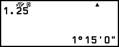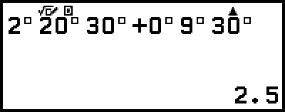 可将计算结果转换为度分秒形式。 将计算结果转换为度分秒形式 示例:1.25 = 1°15’0” 125 () – [度分秒] 输入度分秒值并计算 除了将显示的值转换为度分秒值,还可输入度分秒值并在计算中使用。 以下是用于输入度分秒数值的语法: {度} () {分} () {秒} () 请注意,即使度和/或分的值为 0,也必须为度和/或分输入数值 0。示例:执行计算 2°20’30” + 9’30”。接下来,将计算结果转换为小数。 2()20()30() 0()9()30() () – [小数](转换为小数。) () – [度分秒](恢复度分秒显示。)