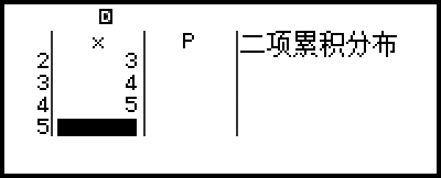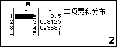 示例:计算 N(试验次数)= 5 且 p(成功概率)= 0.5 时 x 数据 {2, 3, 4, 5} 的二项分布的累积概率