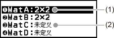 矩阵变量列表界面是操作入口,如果将矩阵存储到矩阵变量 MatA、MatB、MatC 或 MatD,或要编辑之前存储的矩阵,应使用此界面。每个矩阵变量的状态如下图所示。