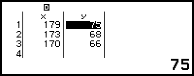 在统计数据编辑界面上,可将单元格中的数值存储到变量中。例如,在显示上面步骤 3 中的界面时执行以下操作会将 68 存储到变量 A 中:
