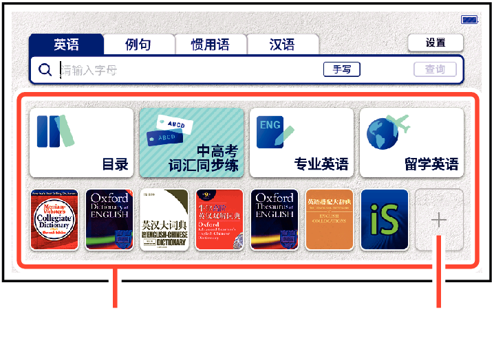 将常用词典等内容登录到HOME画面(最多14个)后,可轻松地从HOME画面打开相应的词典。登录的内容可在以后移动位置、交换位置或解除登录。