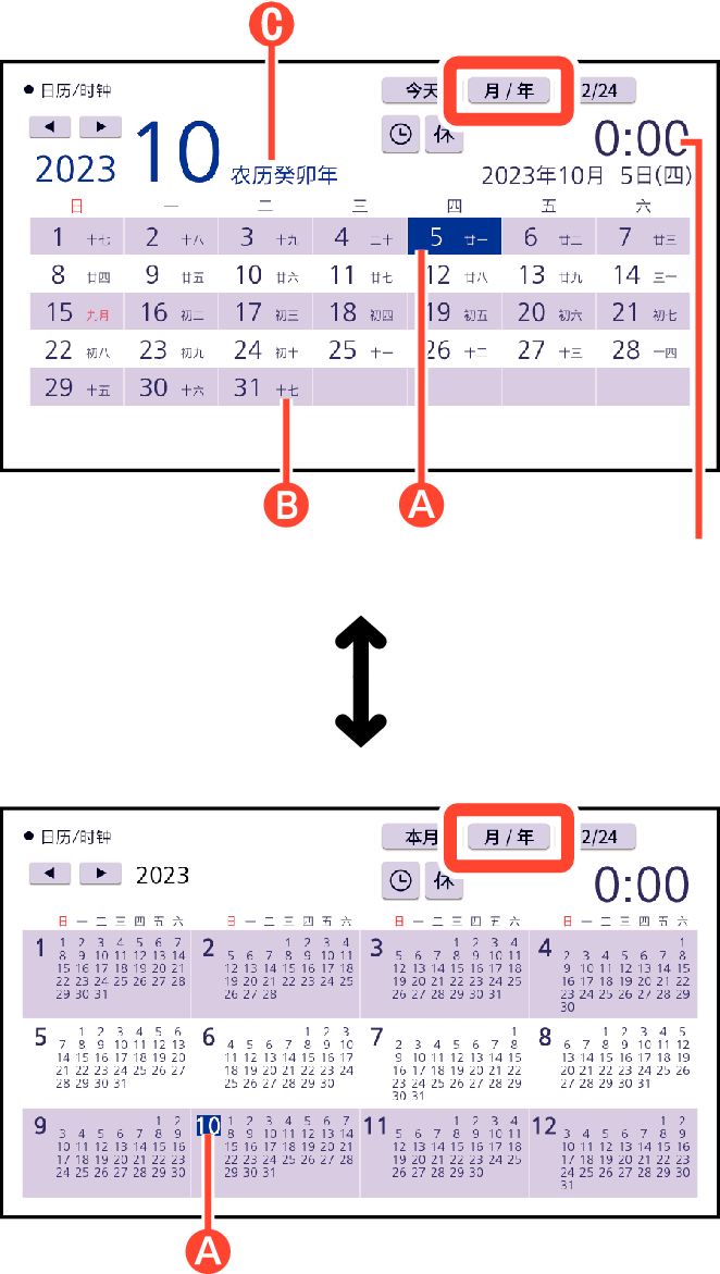 显示“日历/时钟”画面后,可切换“年份显示/月份显示”、“12小时显示/24小时显示”等显示方法,也可更改时间或假日的设置。