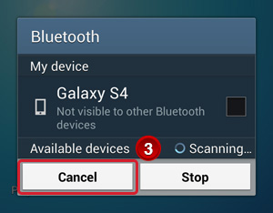3 在通知面板上,点击 [Bluetooth] 从关闭切换至打开。此时手机将开始扫描 Bluetooth 设备。点击 [Cancel](取消)。