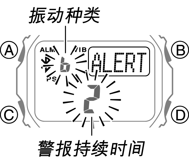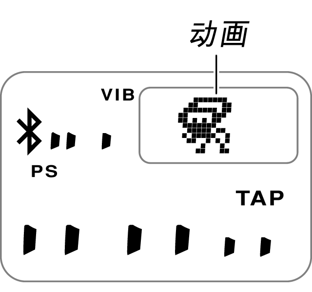 每按一次 B,振动类型设定将会依次在 [A]、[b]、[C] 之间循环切换。在您更改这些设定后,手表会根据您的更改执行相应的示范振动。b.动画显示打开/关闭 b.