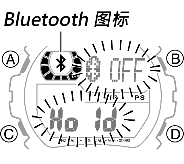 当您在医院中、飞机上或是其他禁止使用无线电信号的场所时,您可以通过在“计时模式”下按住手表的 B 按钮约 2 秒,禁用无线电信号发射功能。此操作也将使 Bluetooth 图标从手表显示屏上消失。