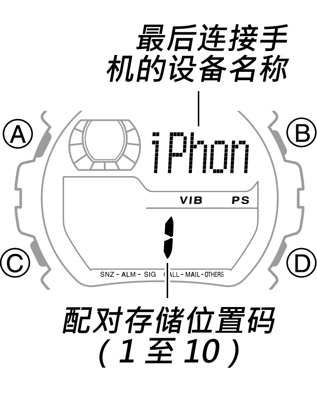 - 在手表上,使用 D 按钮滚动浏览匹配存储位置直至您希望与之连接的手机的匹配存储位置出现。