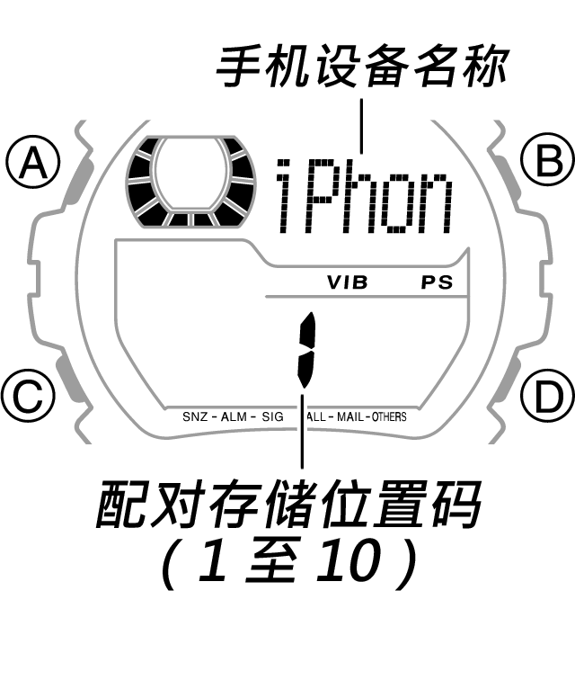 *2 在所有已配对手机的设备名称屏幕均显示后按下 D 按钮,则会返回手表设备名称屏幕。
