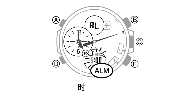(B) 和 (E) 按钮:用于更改当前选择的数字(时或分)。