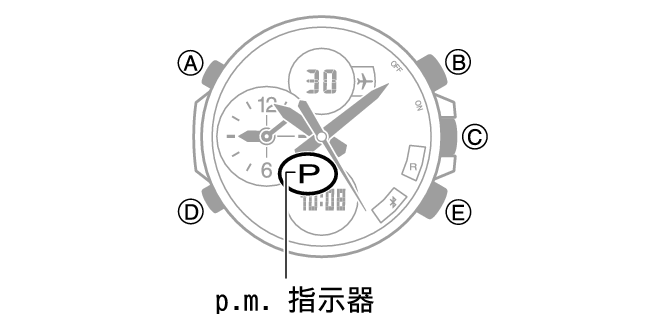 切换为 12 小时或 24 小时计时制 1.按住(A)按钮约 2 秒。 [SET] 将首先出现,然后显示“本地时间城市”名称。 2.按 (D) 4 次,直到当前设置 ([12H] 或 [24H]) 在显示屏上闪烁。 3.按 (E) 以在 [12H](12 小时计时制)和 [24H](24 小时计时制)之间切换设置。 4.按 (A) 2 次以退出设置屏幕。