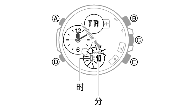 (D) 按钮:在时钟和分钟间移动闪烁。