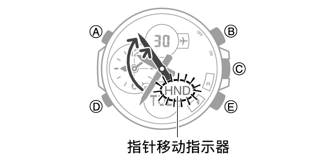 移动指针 移动时针和分针可便于查看显示信息。 1.要移动时针和分针,按下 (D) 时按住 (B)。 这将使时针和分针移到不会挡住数字显示的位置。 移动指针时,指针移动指示器会闪烁。 示例: 时间到达 10:35 点时移动指针 2.要使指针返回其正常位置,再次按下(D)时按住(B)。