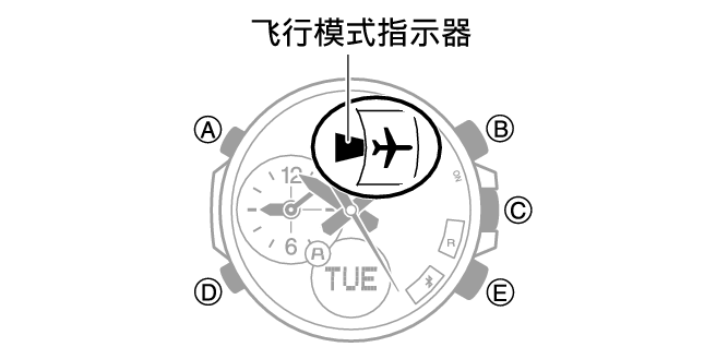 进入手表飞行模式 使用“飞行模式”禁用 Bluetooth 无线电波发射。当在医院、机场或其它限制无线电波发射的地方时,请使用“飞行模式”。 按下 (D) 约 5 秒,直至出现“飞行模式”指示器。 每次按住 (D) 约 5 秒,手机将进入或退出“飞行模式”。