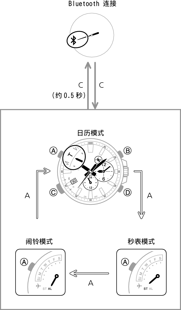 使用(A)在模式之间导航。按下(A)大约两秒将进入“日历模式”。要与手机连接,请按下(C)大约 0.5 秒。