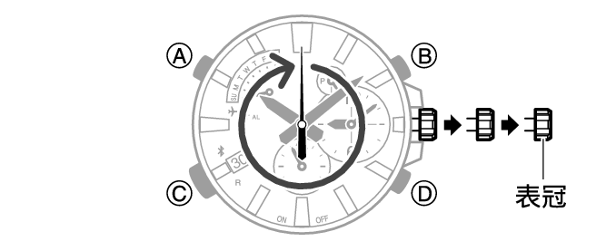 将手表返回至出厂默认设置 本节介绍如何使用 CASIO WATCH+ 将下列手表设定恢复到初始出厂默认值。 时间调整 世界时间 闹铃 连接时间 1. 将表冠拉出到第二档。 2. 按住(C)约 5 秒。 这样将使秒针转一圈,将适用的设定恢复到出厂默认值。
