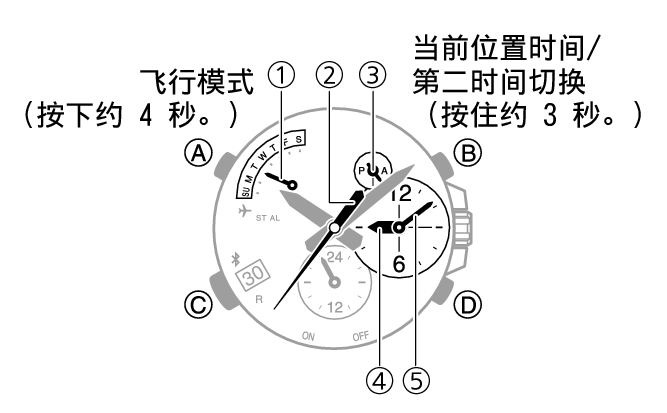 在此模式下,主时针和分针指示现在时间,短时针和分针显示第二个时间(第二时间)。