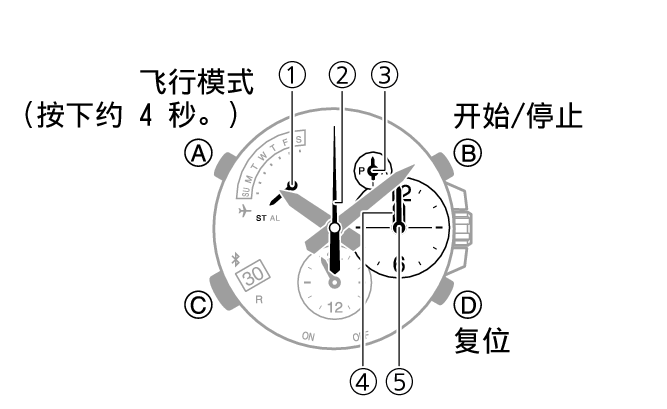 在此模式下,主时针和分针指示现在时间,短时针和分针显示秒表测量的运行时间。