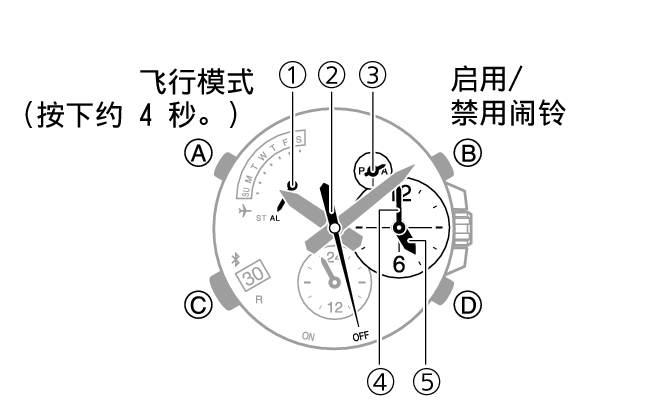 在此模式下,主时针和分针指示现在时间,短时针和分针显示闹铃时间设置。