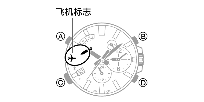 进入手表飞行模式 使用“飞行模式”禁用 Bluetooth 无线电波发射。当在医院、机场或其它限制无线电波发射的地方时,请使用“飞行模式”。 1. 按下 (A) 大约四秒,直至模式针移至飞机标志。 手表将进入“飞行模式”。 每次按住(A)约 4 秒,手机将进入或退出“飞行模式”。